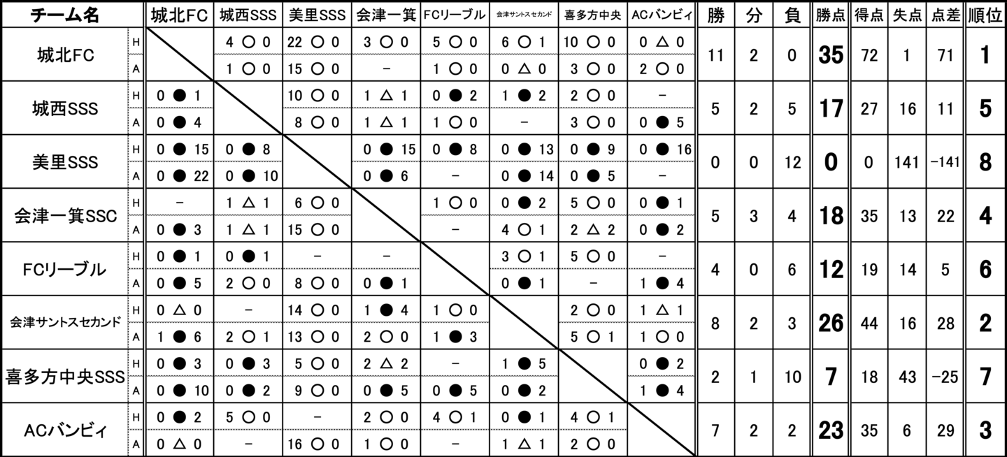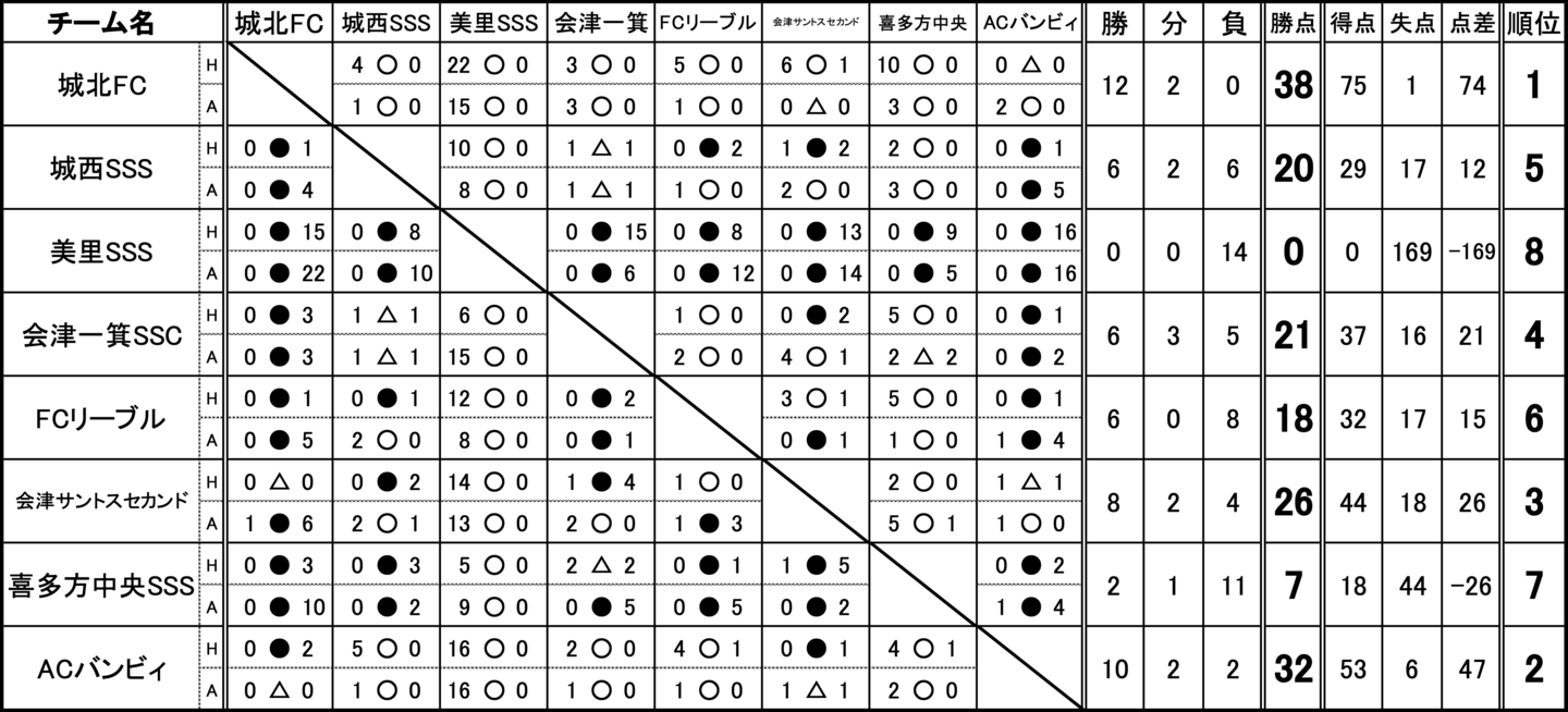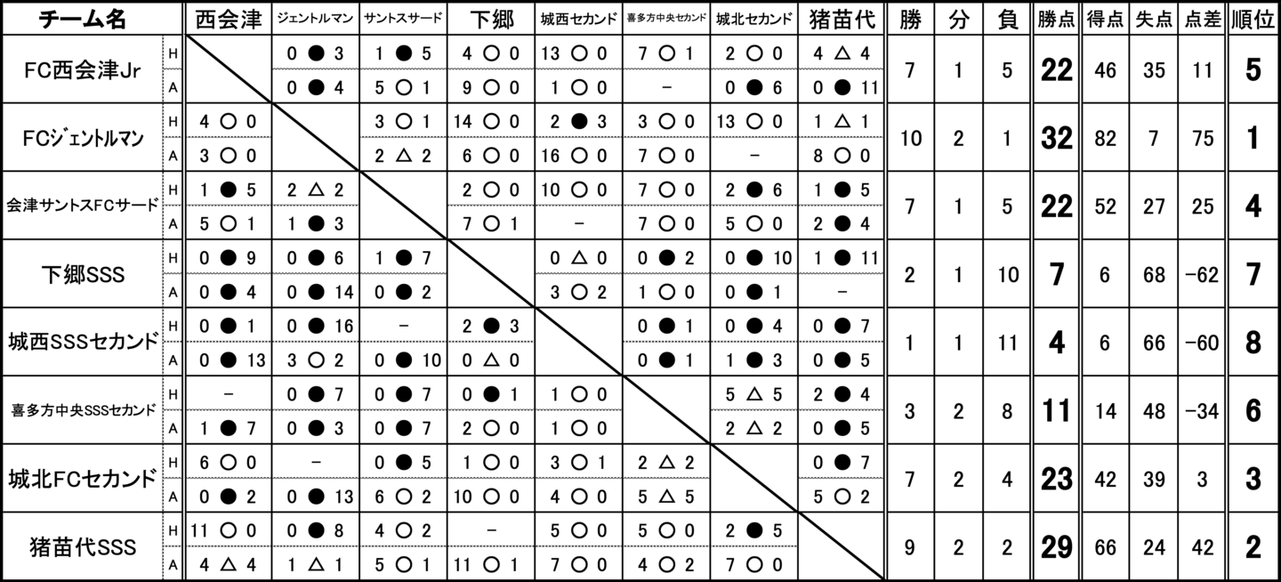 1部リーグ 2部リーグ 城北FC、城西SSS、美里SSS、会津一箕SSC、FCリーブル、会津サントスセカンド、喜多方中央SSS、ACバンビィ 日程表 ダウンロード FC西会津Jr、FCジェントルマン会津、サントスFCサード、下郷SSS、城西SSSセカンド、喜多方中央SSSセカンド、城北FCセカンド、猪苗代SSS 日程表 ダウンロード