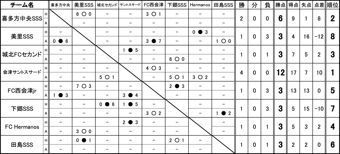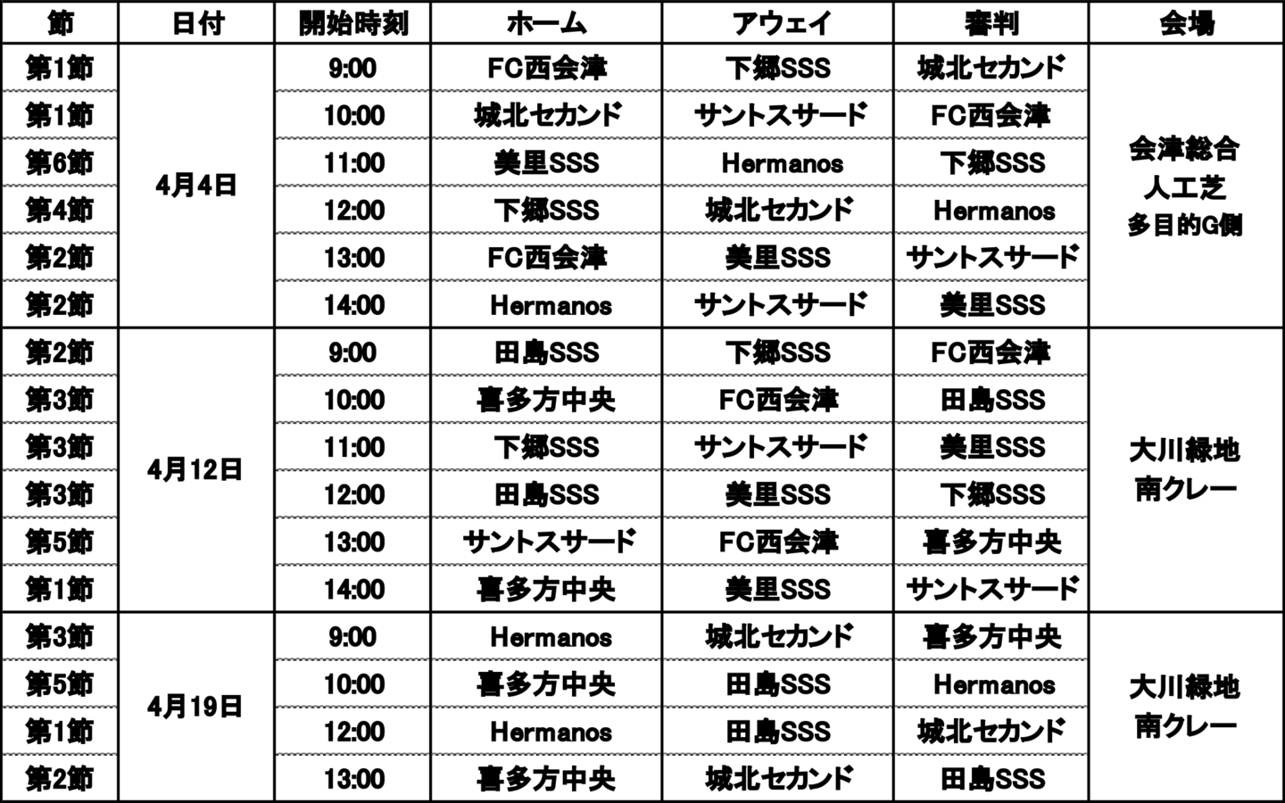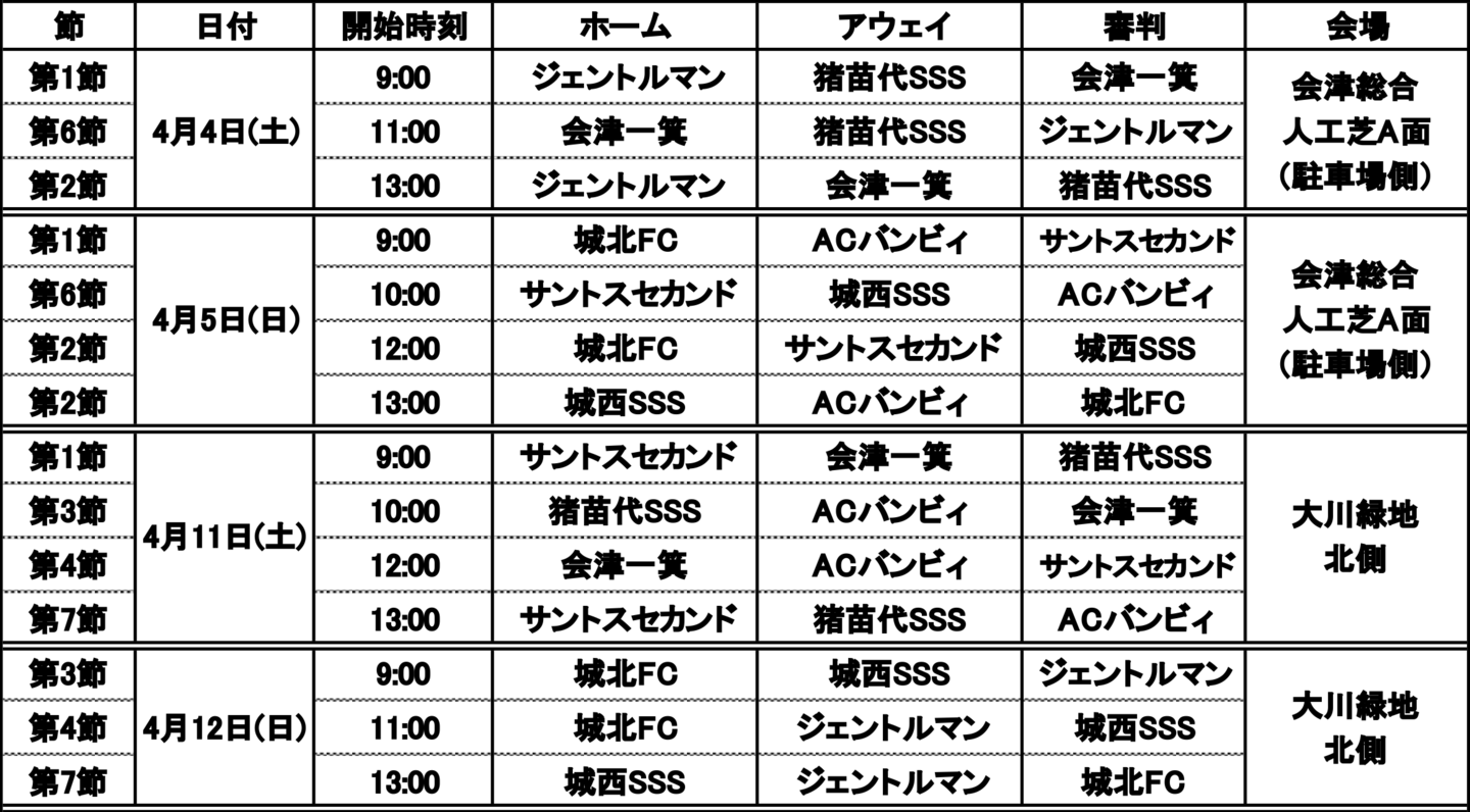 1部リーグ 2部リーグ 城北FC、ACバンビィ、会津サントスセカンド、会津一箕SSC、城西SSS、FCリーブル、FCジェントルマン、猪苗代SSS 日程表 ダウンロード 喜多方中央SSS、美里SSS、城北FCセカンド、サントスFCサード、FC西会津Jr、下郷SSS、FC Hermanos、田島SSS 日程表 ダウンロード