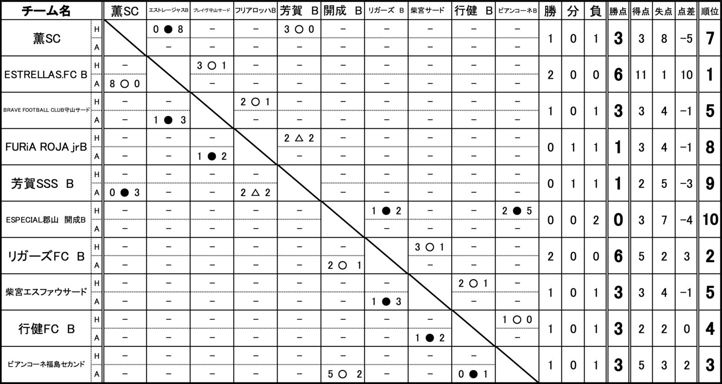 薫SC、ESTRELLAS.FC B、BRAVE FOOTBALL CLUB守山サード、FURiA ROJA jrB、芳賀SSS B、ESPECIAL郡山 開成B、リガーズFC B、柴宮エスファウサード、行健FC B、ビアンコーネ福島セカンド