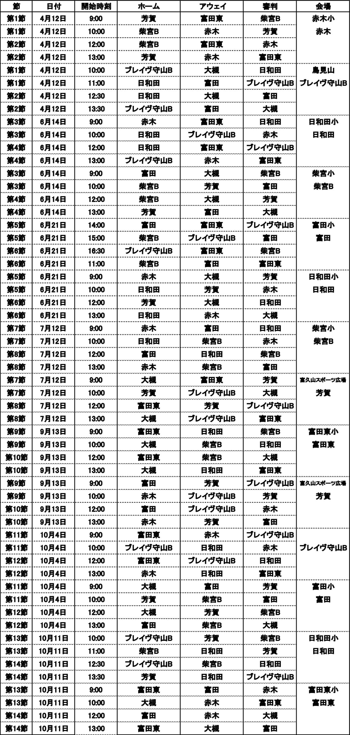 富田東、大槻FC、富田SSS、赤木SSS、BRAVE FOOTBALL CLUB守山B、芳賀SSS、柴宮エスファウB、日和田FC