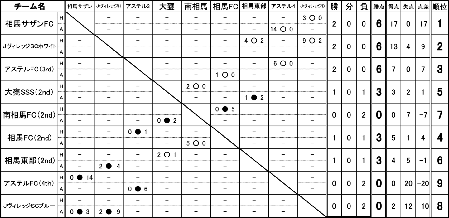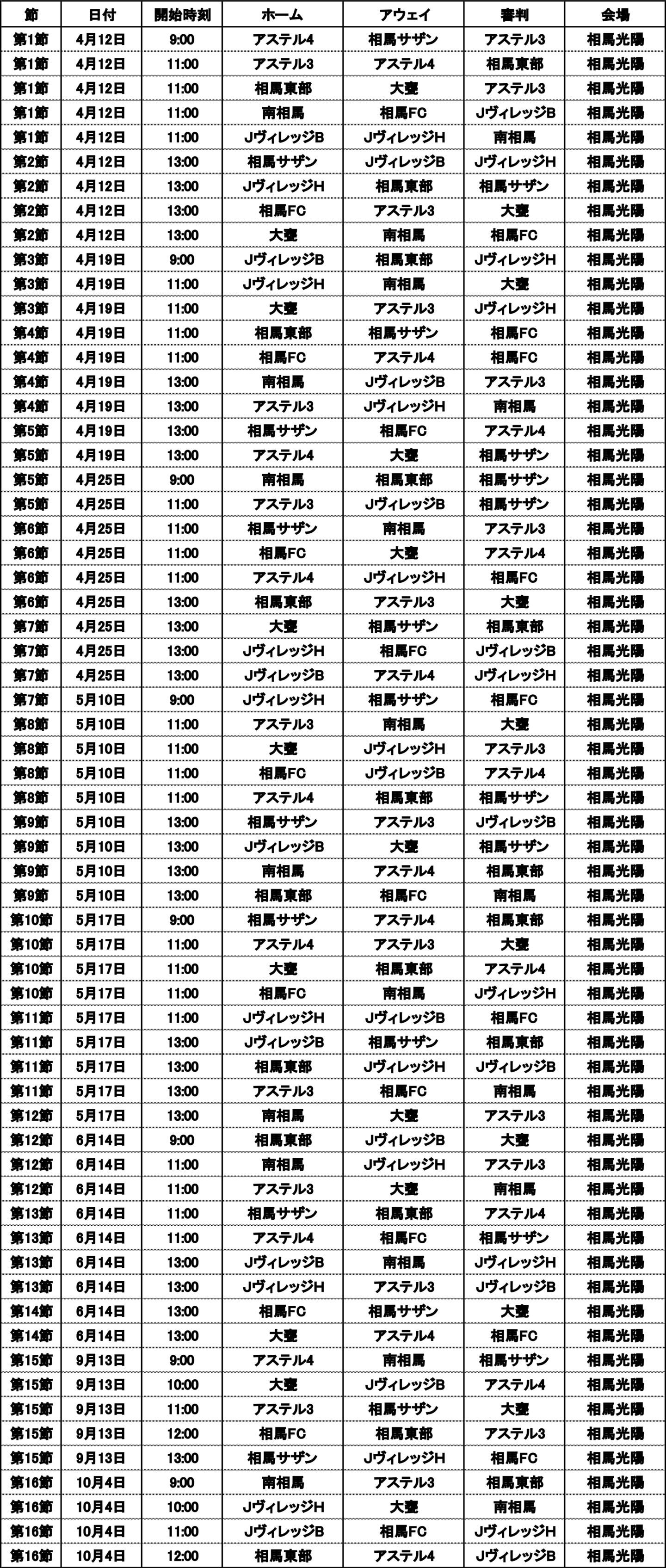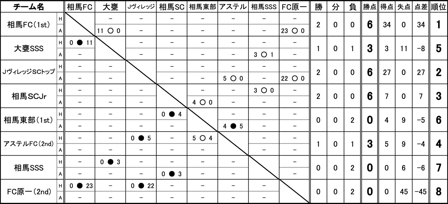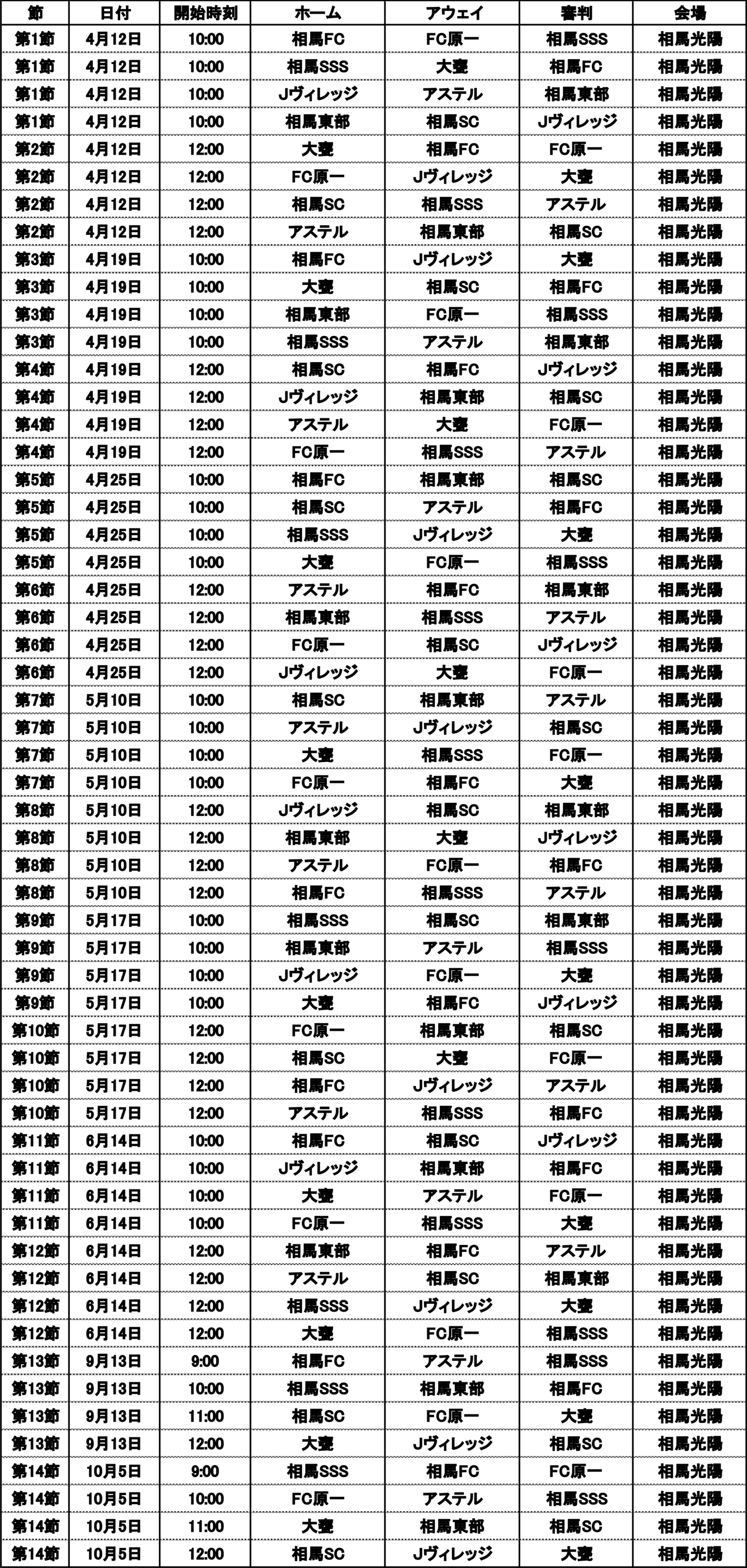 1部リーグ 2部リーグ 相馬FC(1st)、大甕SSS、JヴィレッジSCトップ、相馬SCJr、相馬東部(1st)、アステルFC(2nd)、相馬SSS、FC原一(2nd) 日程表 ダウンロード 相馬サザンFC、JヴィレッジSCホワイト、アステルFC(3rd)、大甕SSS(2nd)、南相馬FC(2nd)、相馬FC(2nd)、相馬東部(2nd)、アステルFC(4th)、JヴィレッジSCブルー 日程表 ダウンロード